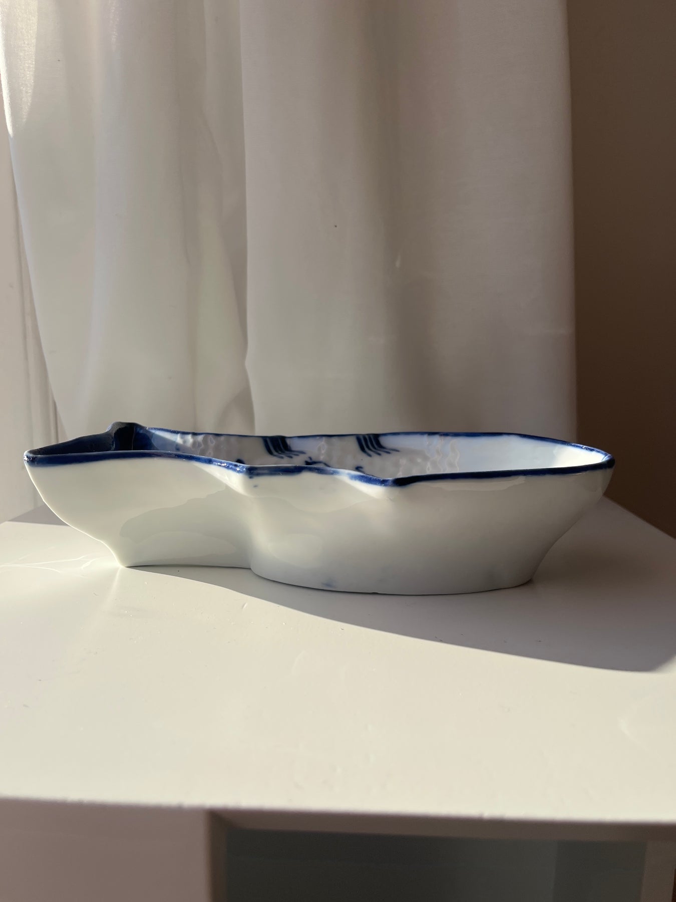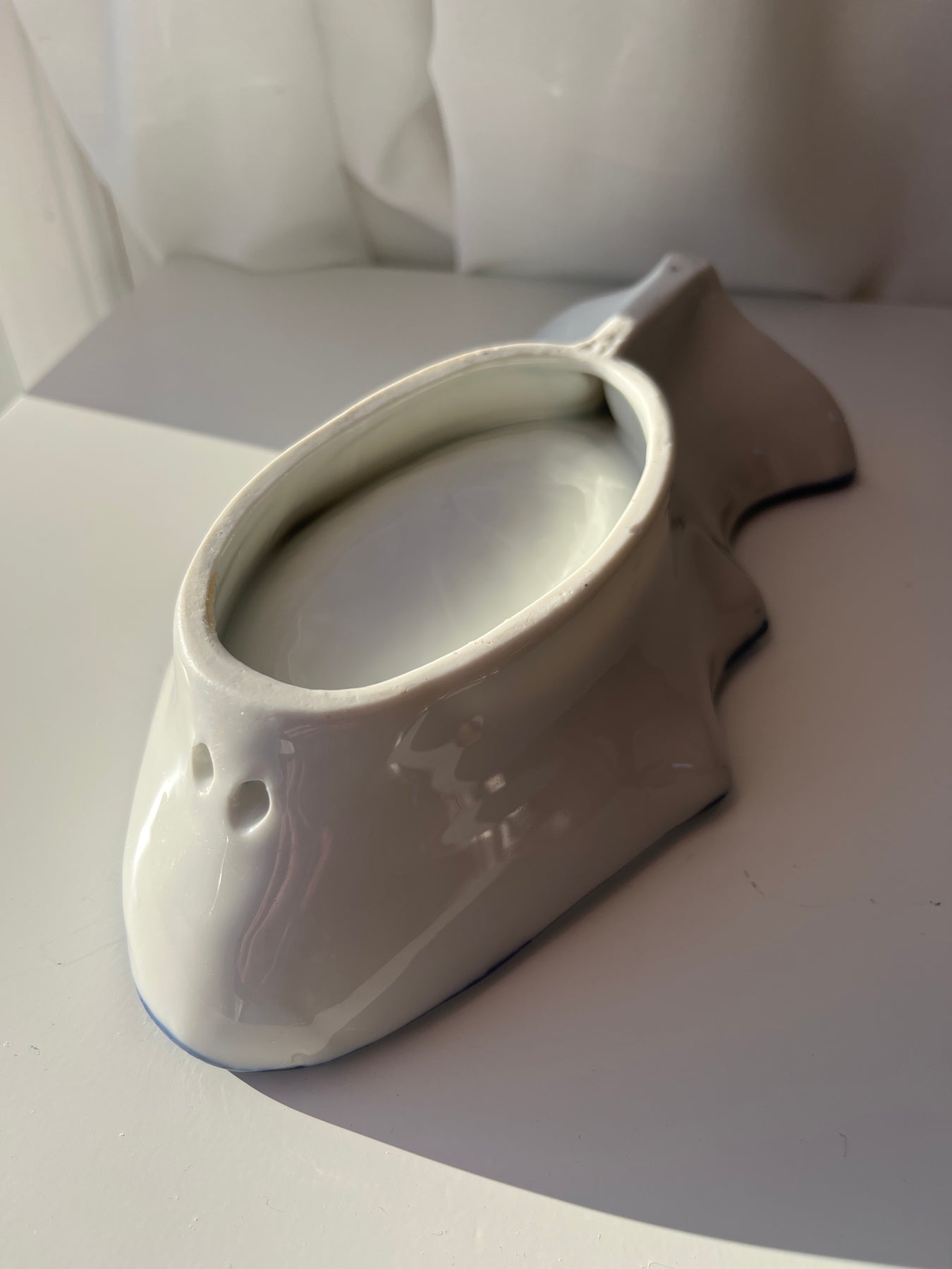 Dette serveringsfad er formet som en fisk og dekoreret med det klassiske Meissen Blue Onion-mønster (Zwiebelmuster). Mønsteret, som blev udviklet af Meissen omkring 1739, er inspireret af kinesisk porcelæn fra Ming-dynastiet og giver fadet et elegant, tidløst udtryk, ideelt til både servering og som dekorativt samlerobjekt.