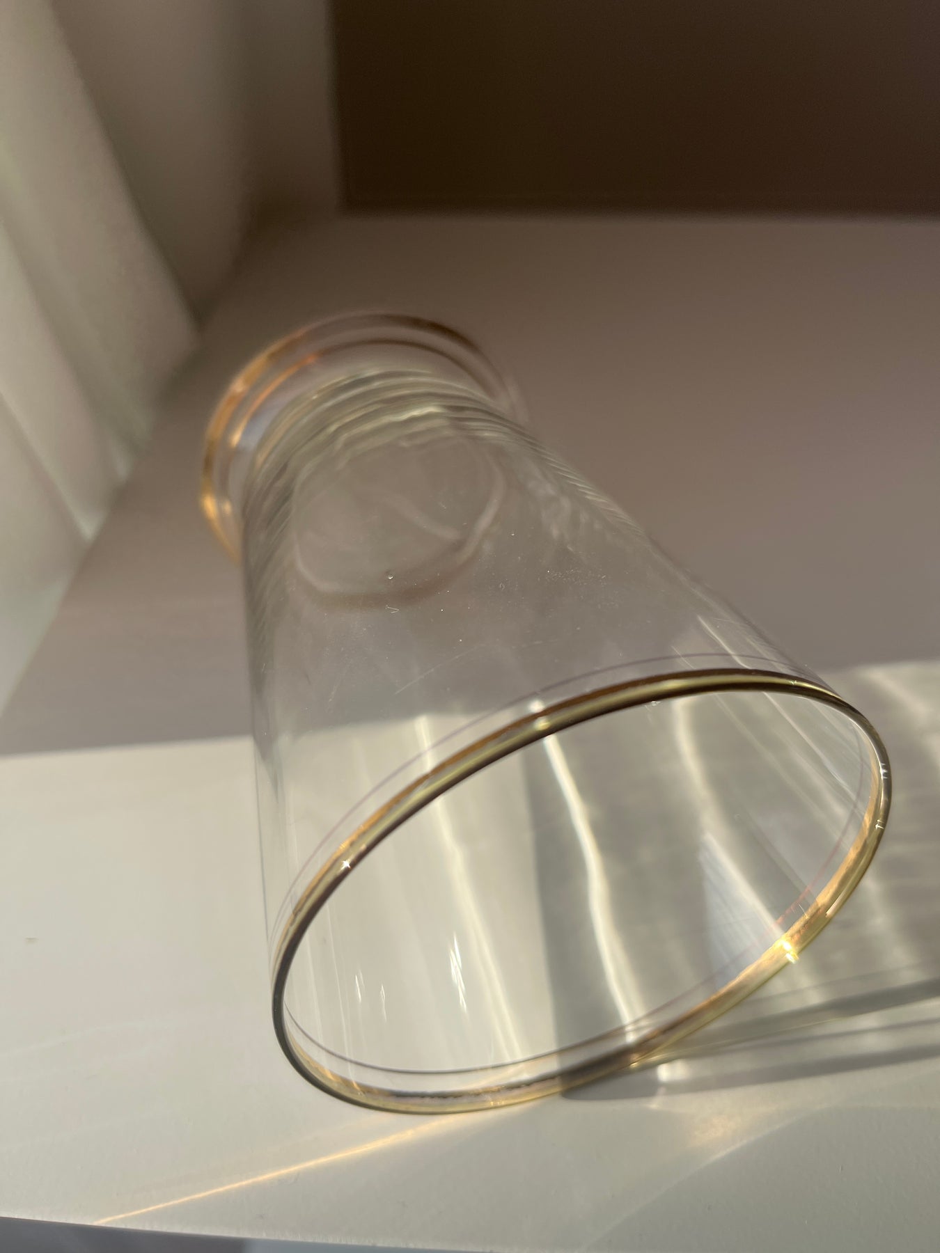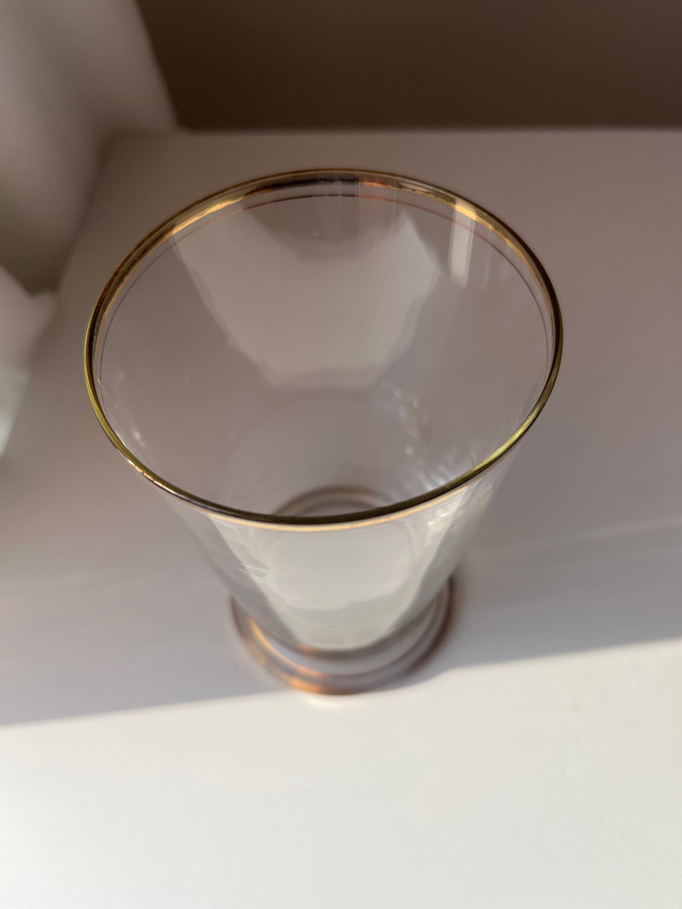 Dette Holmegaard ‘Ida’ glas er designet af Jacob E. Bang i 1935 og er et klassisk eksempel på tidløst dansk design. Glasset har en elegant bølget struktur med optiske striber og fine guldkantdetaljer på rand og fod. Det er en del af en større serie, der omfatter snapseglas, portvinsglas og ølglas, og er ofte håndlavet – små luftbobler kan forekomme som en naturlig del af charmen. Originale glas fra serien er populære samlerobjekter og findes hos antikvitetshandlere og specialbutikker.