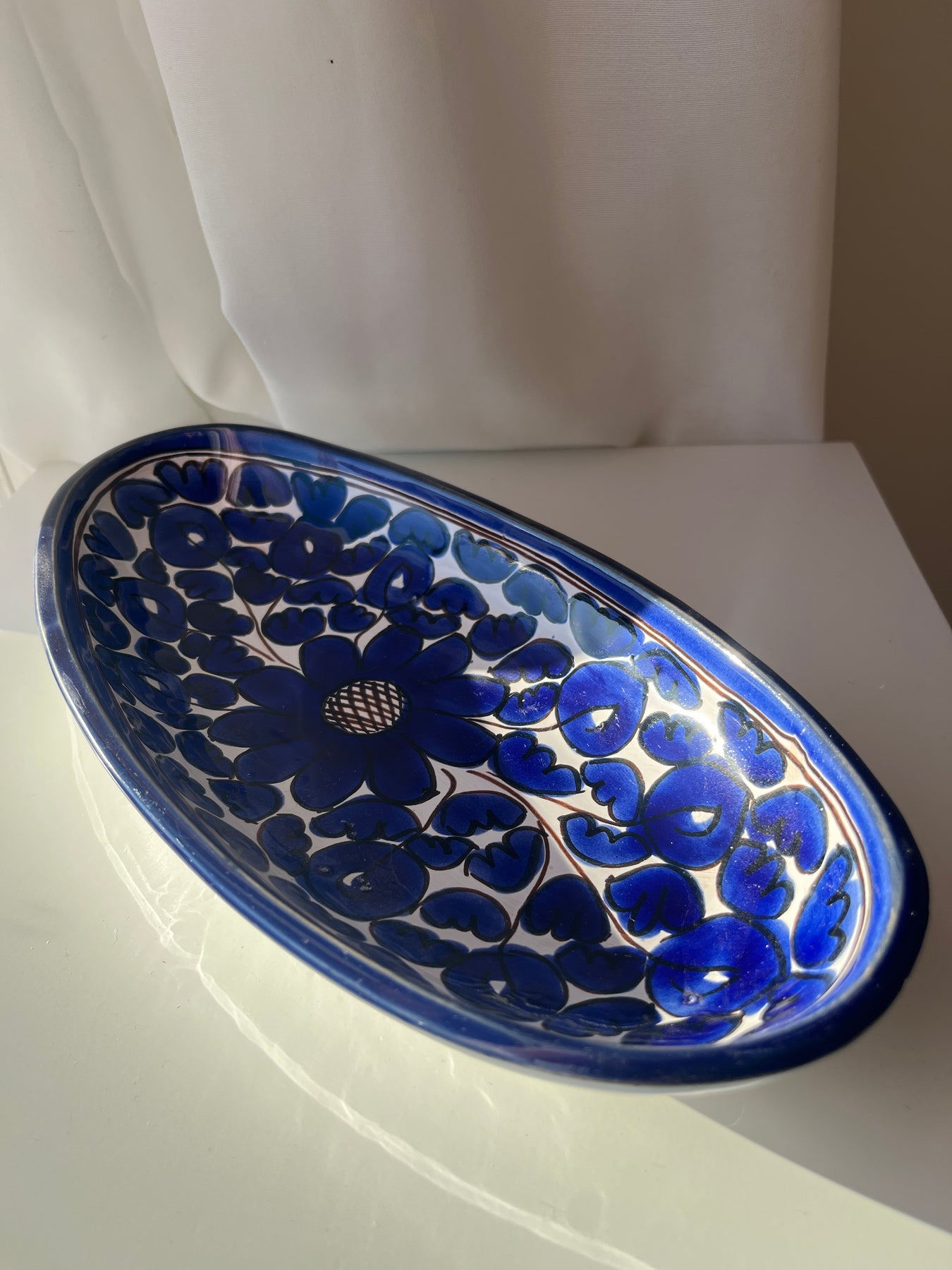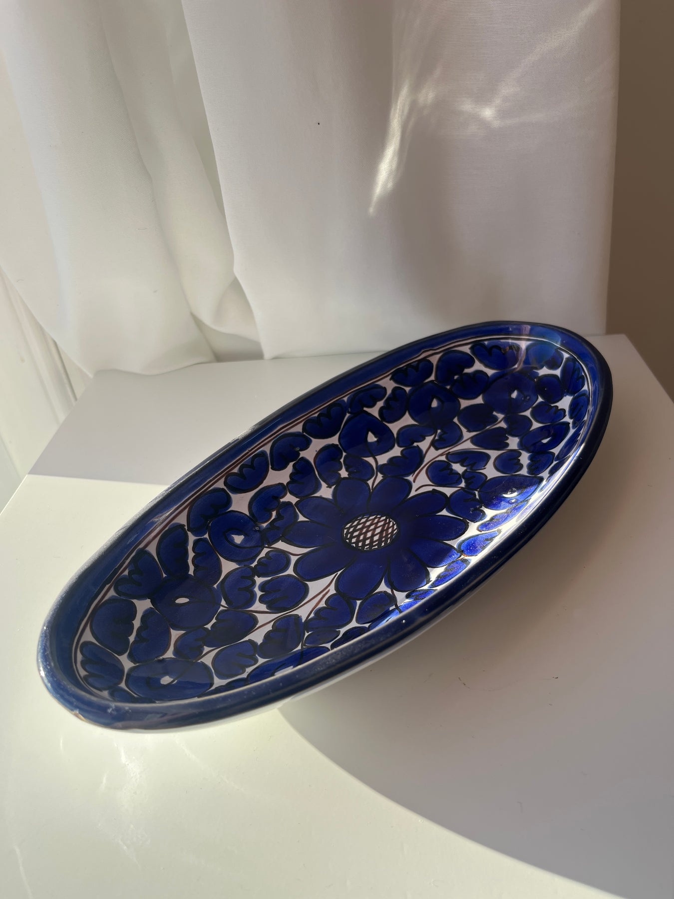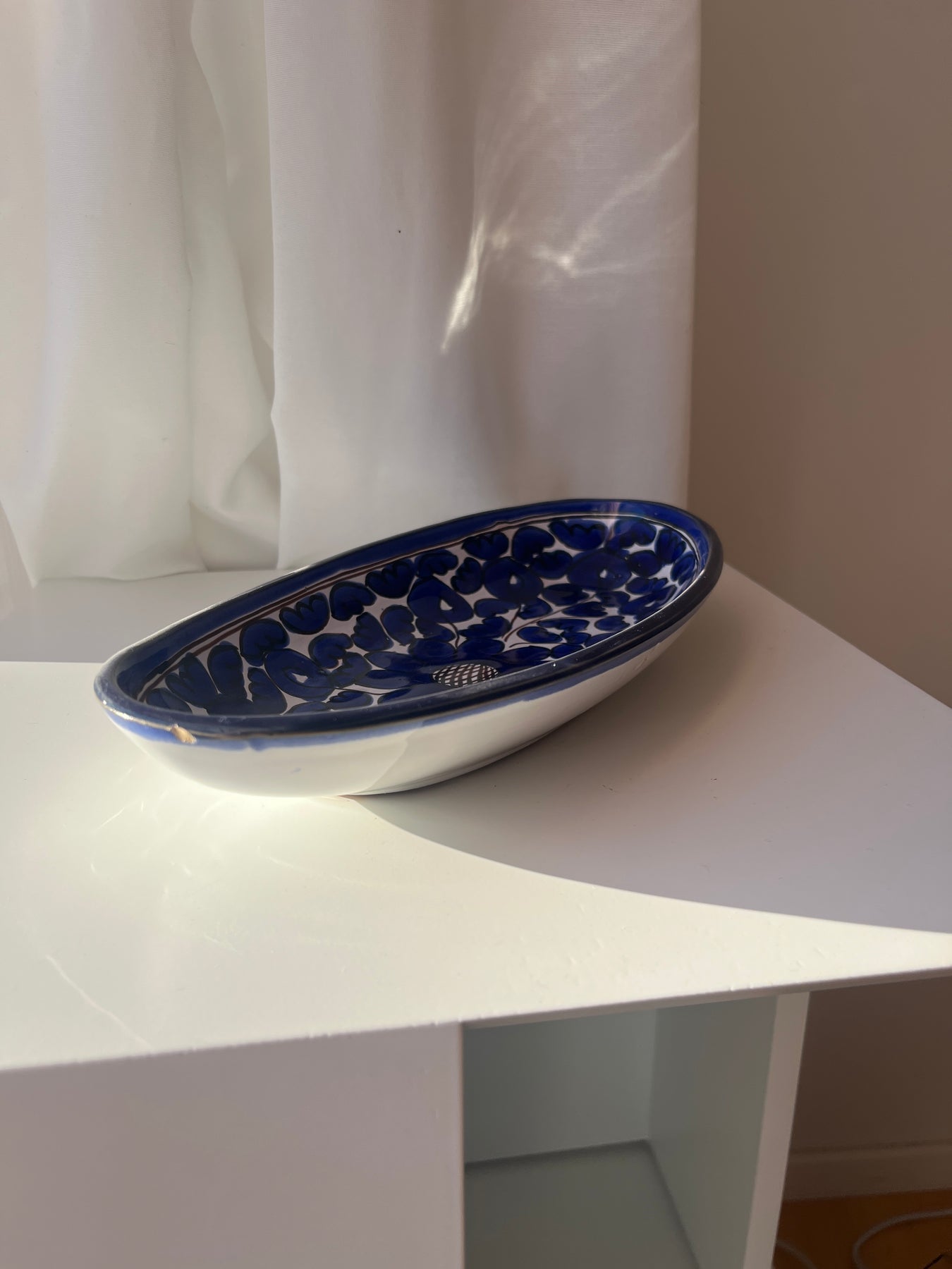 Dette tunesiske keramiske serveringsfad er håndlavet og dekoreret med et smukt, håndmalet blåt blomstermønster. Fadet kombinerer traditionelt håndværk med dekorativ funktionalitet og er perfekt til servering eller som et iøjnefaldende element i hjemmet.