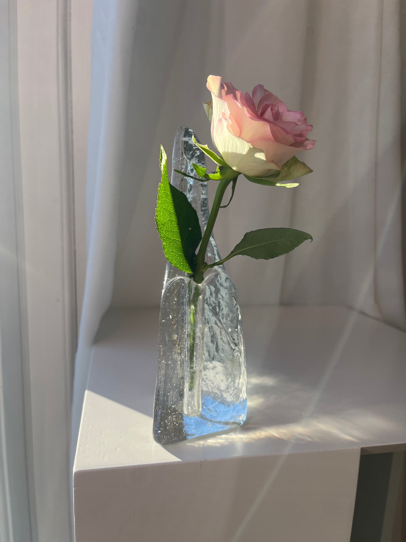 Denne vintage Blenko Art Glass “Iceberg”/“Icicle” vase er lavet i klart, håndblæst glas med en karakteristisk is-tekstur, der giver et skulpturelt og mid-century modern udtryk. Designet, ofte tilskrevet Don Shepherd, er inspireret af smeltende is og kan bruges både som lille vase . Stykket måler typisk omkring 9 cm i højden og er som mange Blenko-arbejder umærket. Fremstillet i 1960’erne–70’erne.