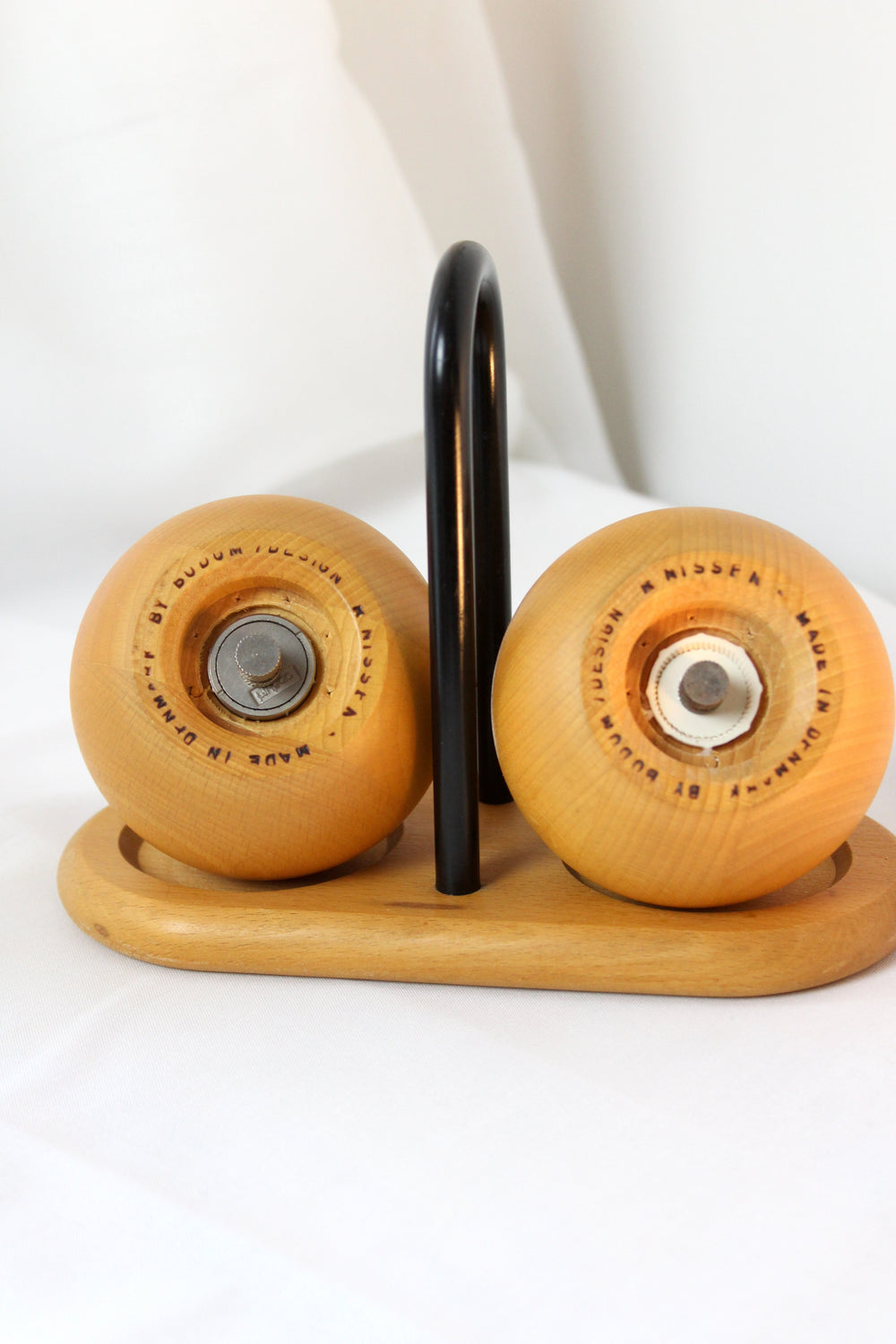 Dieses Vintage Bodum Nissen Salt & Pepper „Ball Boy“-Set mit Halter ist ein ikonisches dänisches Design aus den 1980er Jahren. Das Set wurde von Richard Nissen und Carsten Jørgensen für Bodum entworfen und besteht aus Buchenholz mit Eisengriffen. Es zeigt die bekannte „Ball Boy“-Figur, die die Salz- und Pfeffermühle hält.