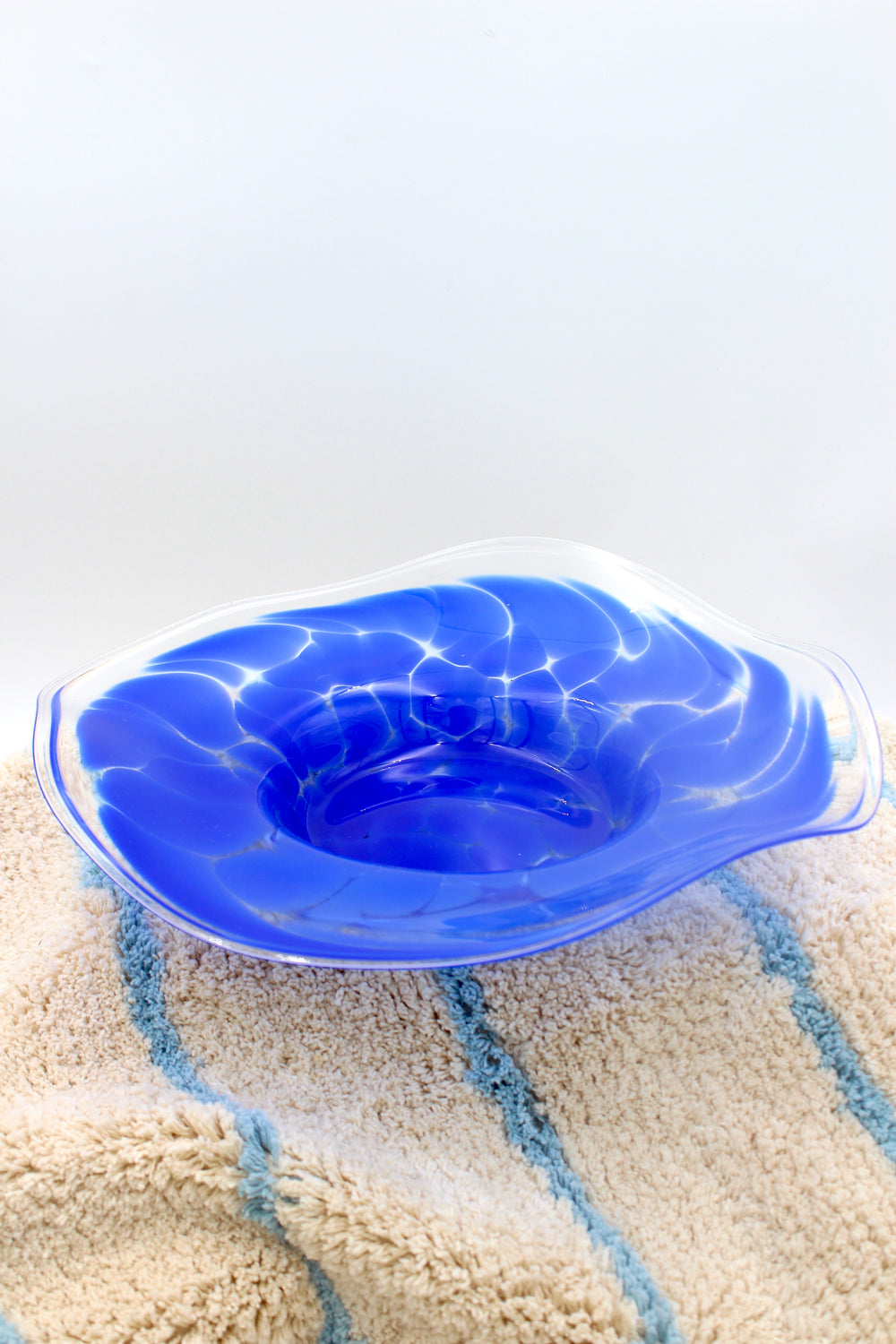 Kobaltblaue Glasschale mit beeindruckender Intensität. Diese Glasschale ist tief und gesättigt in ihrer kobaltblauen Farbe, was diese Glasschale zusammen mit der Fülle und Tiefe der Farbe zu einem auffälligen und eleganten Element in Ihrer Inneneinrichtung macht.