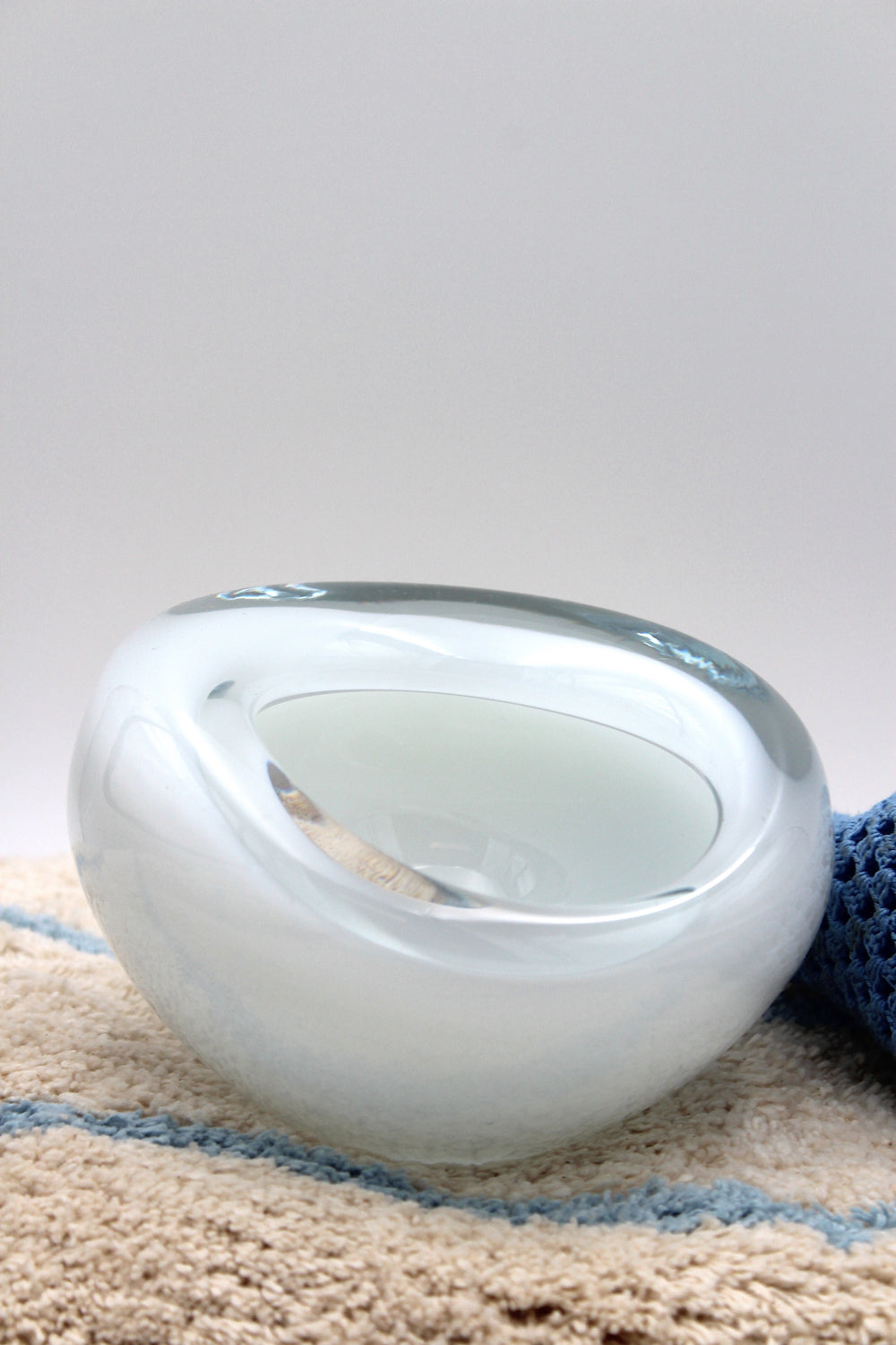 Charakteristischer Aschenbecher aus Per Lütkens Skrå-Serie, hergestellt von Holmegaard im Jahr 1983, der sich hervorragend als vielseitige Schüssel eignet. Dieser Aschenbecher aus Klar- und Opalglas ist ein Beispiel dänischer Designgeschichte und Handwerkskunst vom Feinsten.