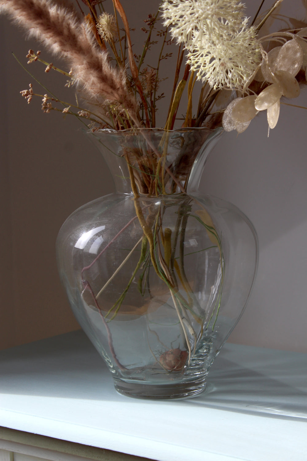 Die große Glasvase aus Klarglas ist ein elegantes und vielseitiges Stück, das sowohl zu moderner als auch zu klassischer Einrichtung perfekt passt. Mit ihrer schlichten, klaren Form bringt die Vase Blumenarrangements wunderbar zur Geltung und verleiht jedem Raum eine luftige und elegante Atmosphäre.