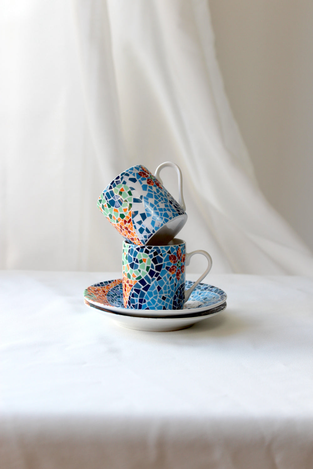 Denne farverige espressokop med underkop er inspireret af Barcelonas ikoniske mosaikdesign. Med sit livlige mønster i forskellige farver bringer den et strejf af spansk kunst og kultur til din kaffepause. Perfekt til at nyde en intens espresso med stil – både til hverdag og særlige øjeblikke.