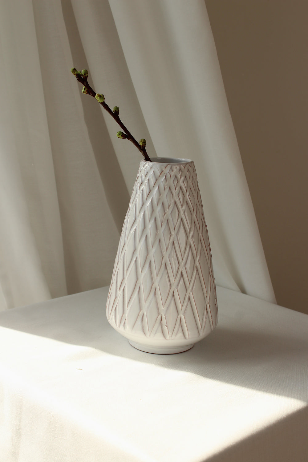 Løvemose hvidglaseret vase er et smukt eksempel på dansk keramiktradition. Den enkle, organiske form og den bløde, hvide glasur giver vasen et tidløst og stilrent udtryk. Perfekt til både blomster og som en dekorativ detalje i hjemmet.
