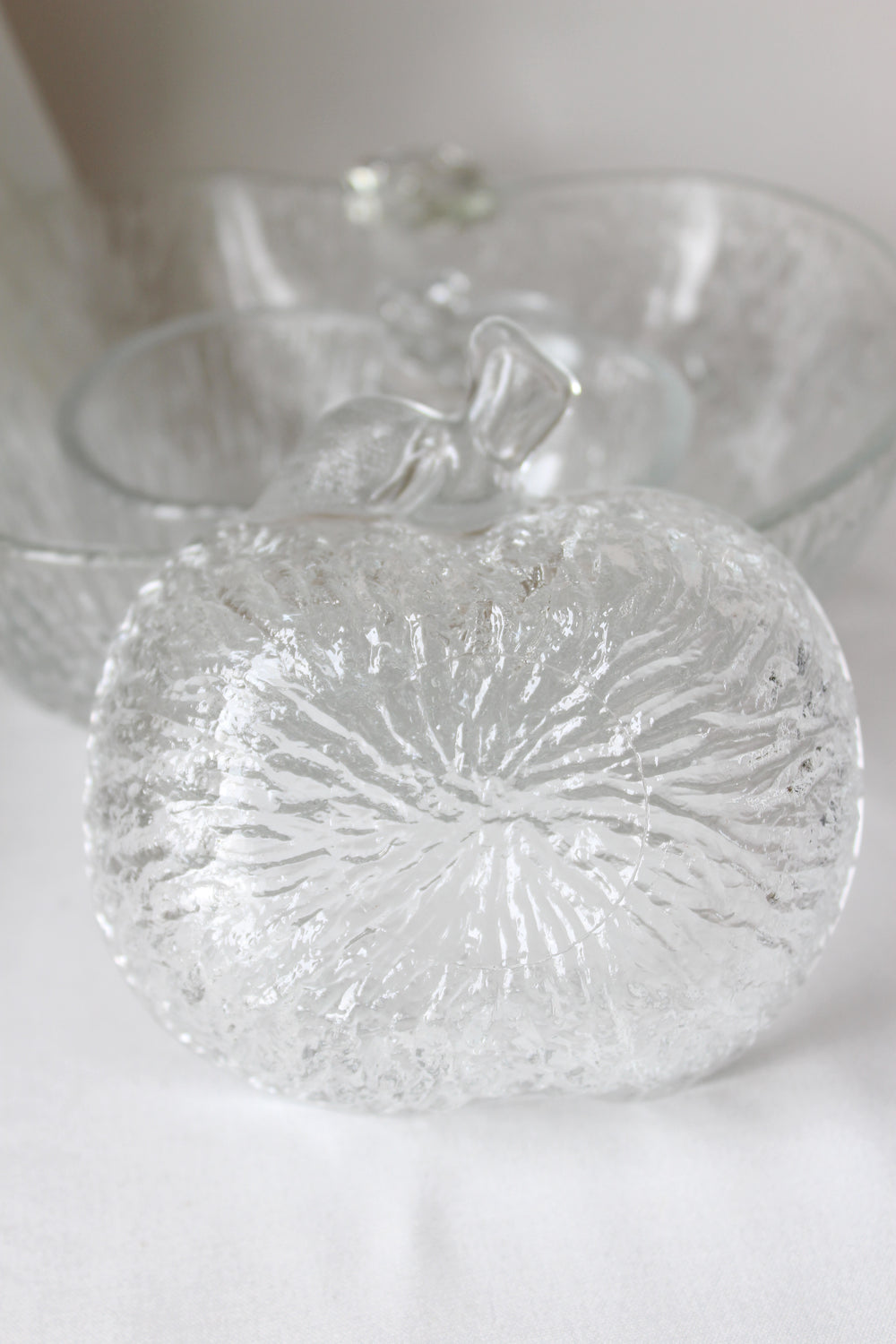 Vintage Apfelschale aus Glas. Die klassische Form und die dekorativen Details der Schüssel machen sie ideal sowohl als funktionale Servierschüssel als auch als dekoratives Element auf dem Tisch. Perfekt für die Präsentation von Obst der Saison oder als einzigartige Ergänzung zu einer Sammlung von Vintage-Küchenaccessoires.