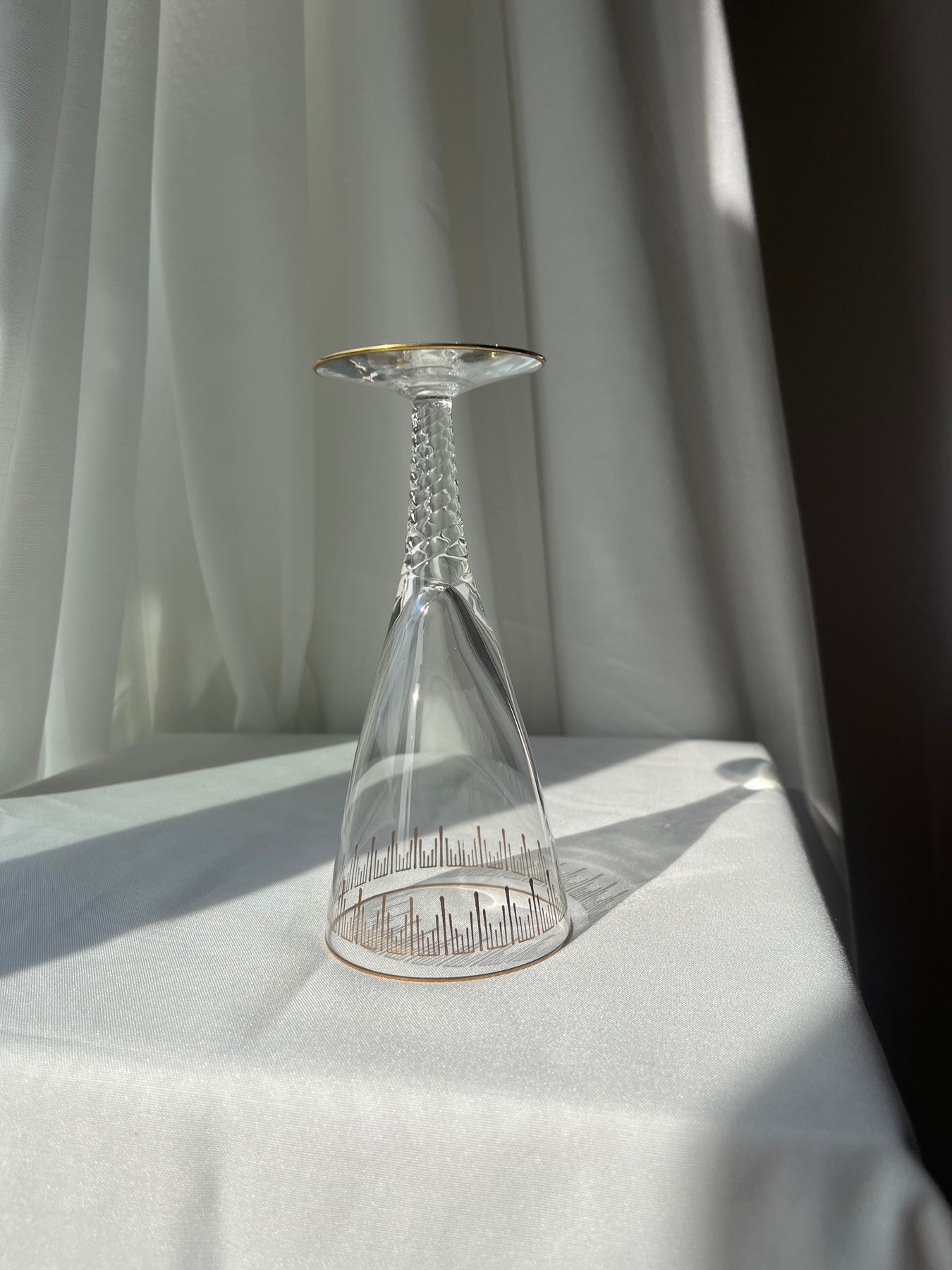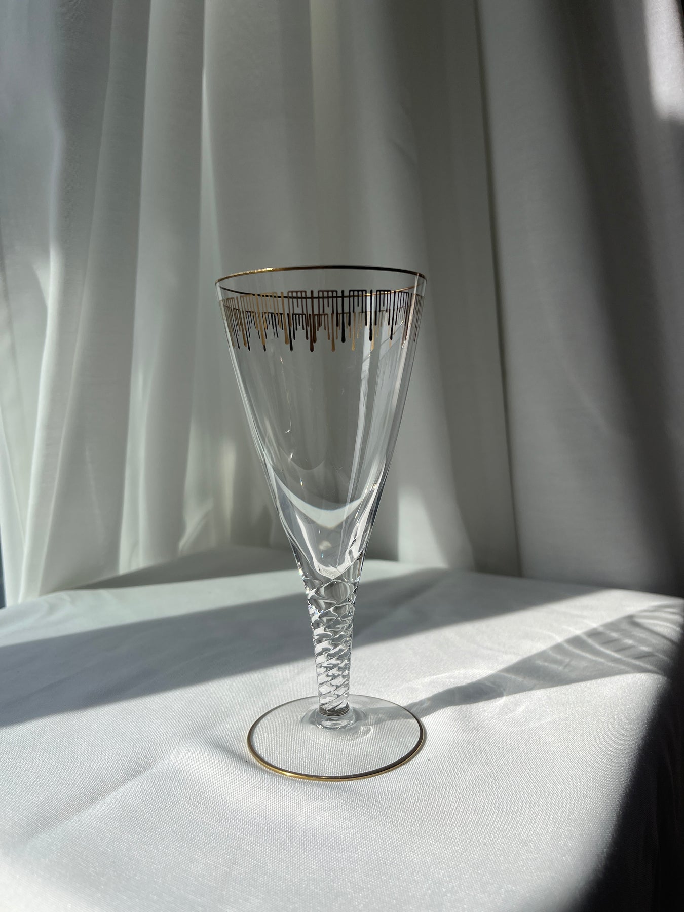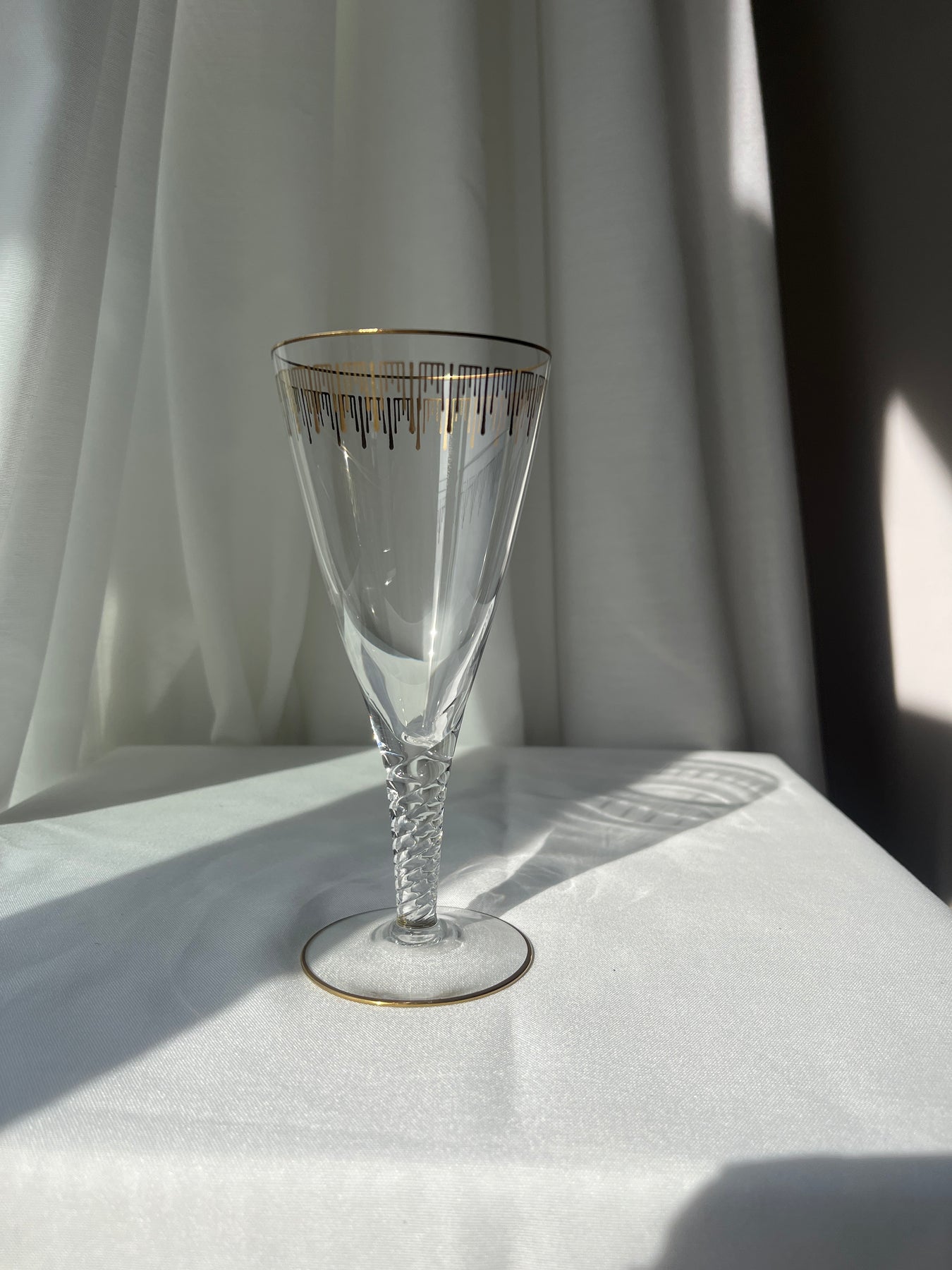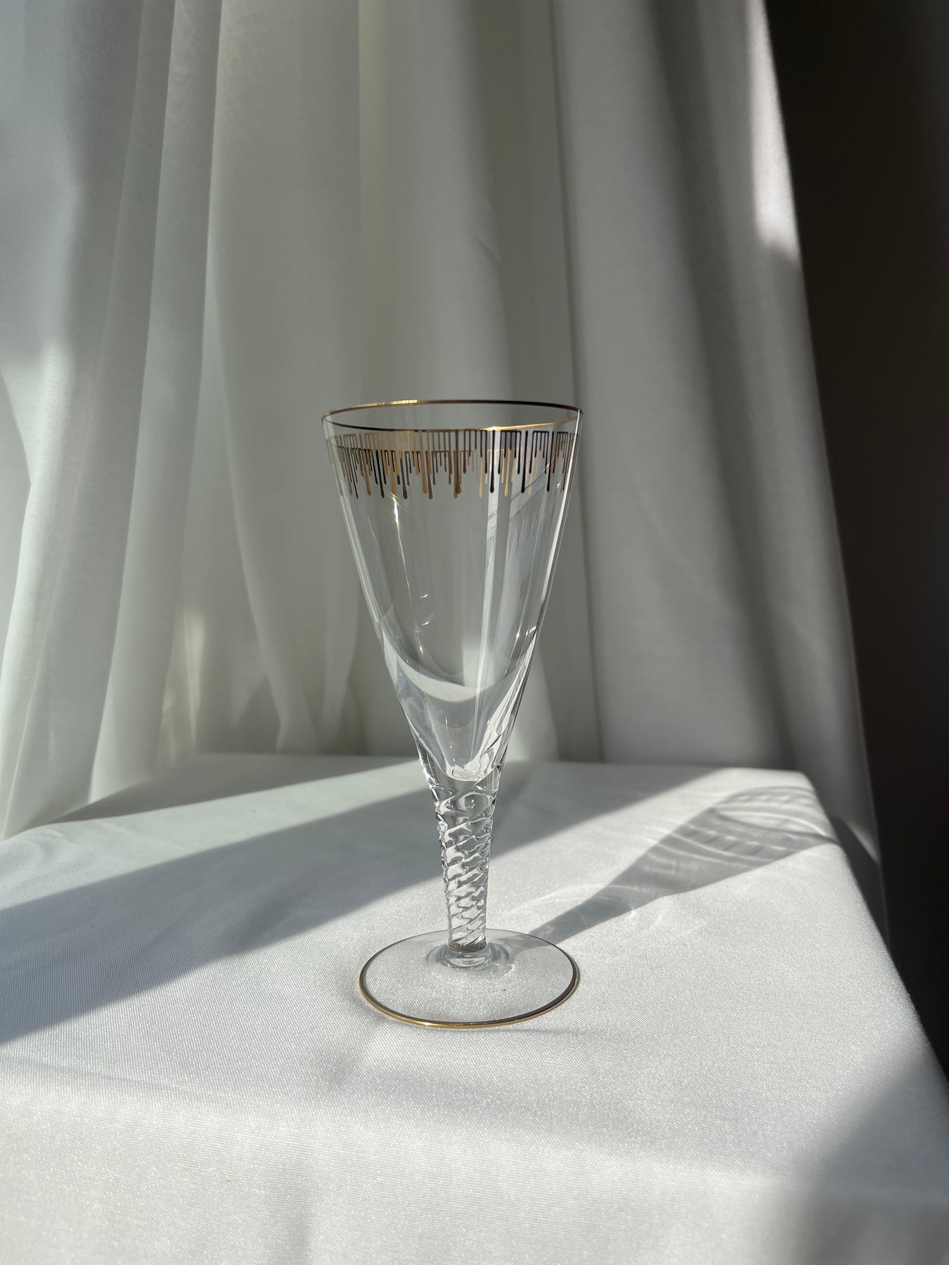 Klassisk Marselisborg vinglas fra Holmegaard Glasværk, designet af Jacob E. Bang og produceret i perioden 1937–1960. Glasset er udført i klart krystalglas med en elegant facetslebet kumme og knop samt en dekorativ guldkant, der understreger dets eksklusive udtryk. Serien er opkaldt efter Marselisborg Slot og er et fint eksempel på dansk designtradition og håndværk fra Holmegaards storhedstid. I dag betragtes glasset som et attraktivt samlerobjekt og anvendes både til vinservering og som dekorativt element.